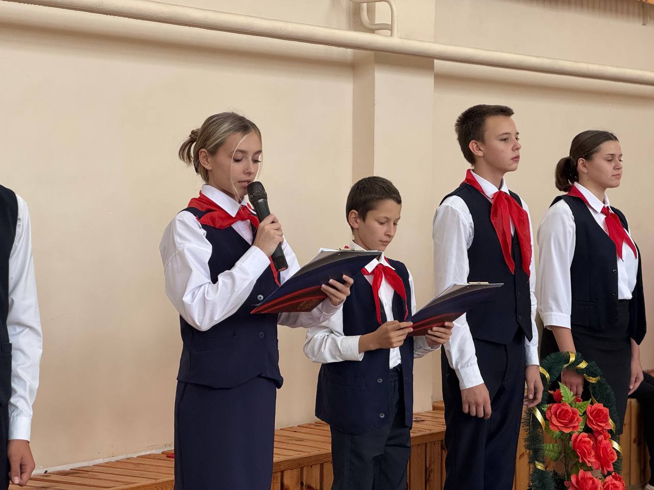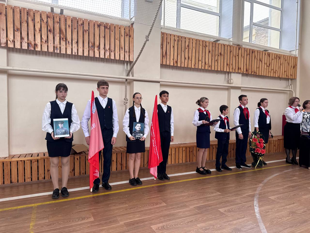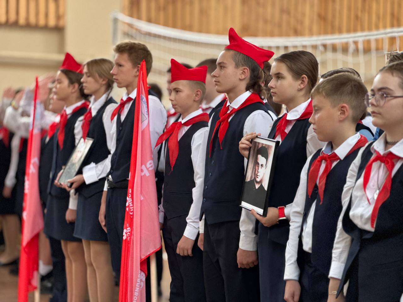 Ведущие мероприятия рассказали о жизни и подвиге Олега Степанова. По сложившейся традиции учащиеся 8-х классов передали знамя пионерским отрядам 5-х классов, которые боролись за право носить их название. После произнесения клятвы отряд 5 «А» класса принял от 8 «А» класса знамя и портрет Героя Советского Союза Алексея Жадова, а отряд 5 «Б» класса принял от 8 «Б» класса знамя и портрет лётчика Василия Леонтьева. Теперь они с гордостью могут носить имена своих пионерских отрядов.